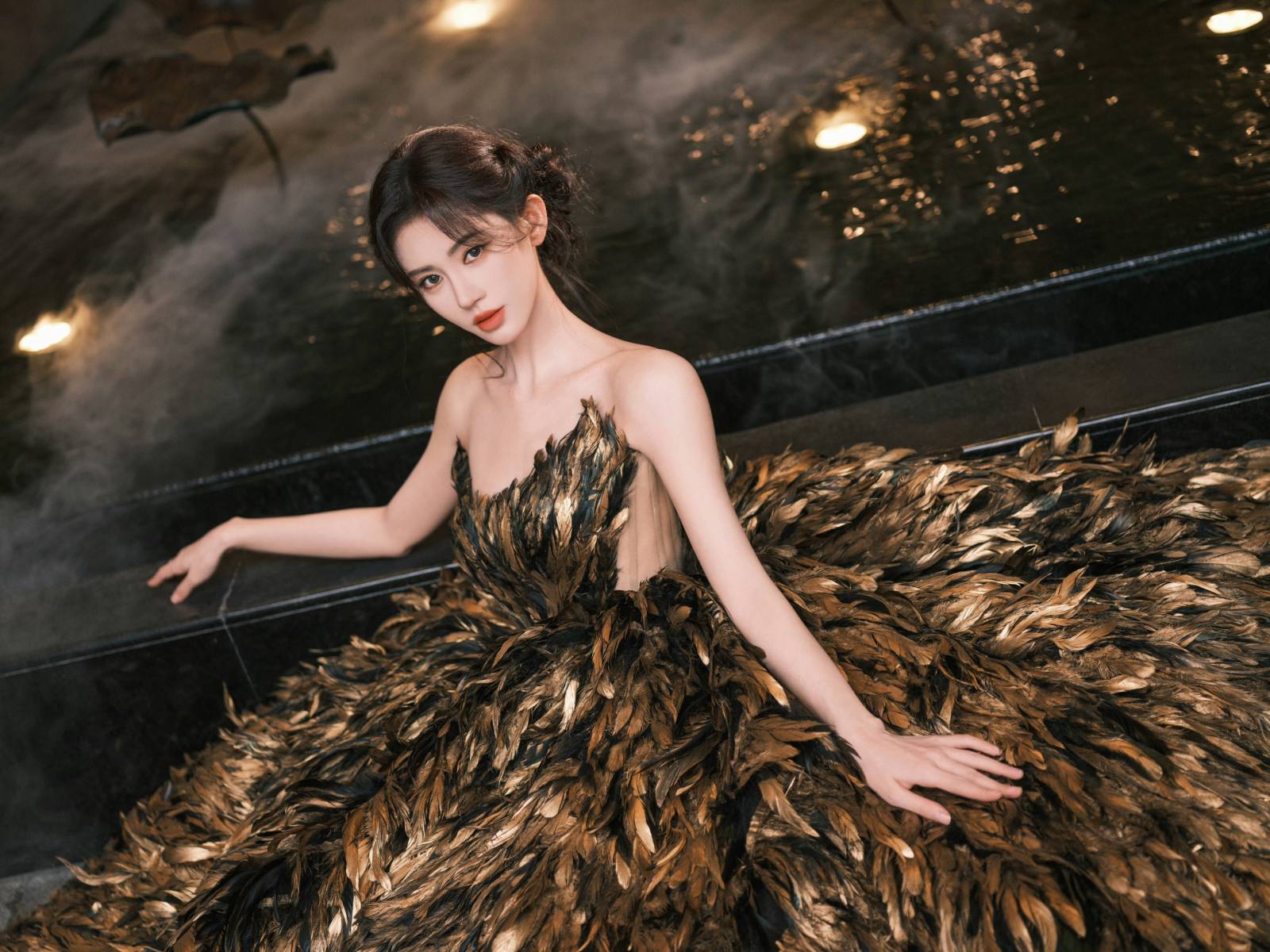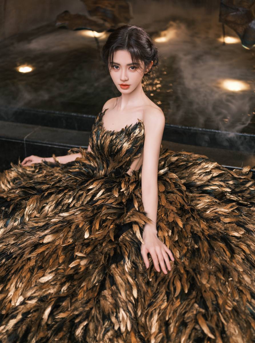 这款礼服裙的设计独特而精致,黑金两色的搭配既显高贵又不失时尚感。黑色的底色神秘而典雅,金色的羽毛点缀则如同夜空中的繁星,熠熠生辉。抹胸的设计展现出鞠婧祎完美的肩颈线条,同时增添了几分性感魅力。