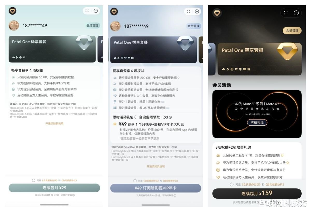 也许有朋友对Petal One不是太了解。简单来说,它是华为应用生态会员的“全家桶”,把云空间、视频、音乐、阅读、主题、运动健康等会员打包在一起,订阅一个套餐开通几个会员,无需一个个单独订阅,既省钱又省事。