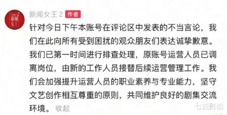 最终《新闻女王》方选择道歉,表示将原有运营调离岗位(热搜用词是开除,声明说的是调离岗位,具体是否开除并未有明确消息)。
