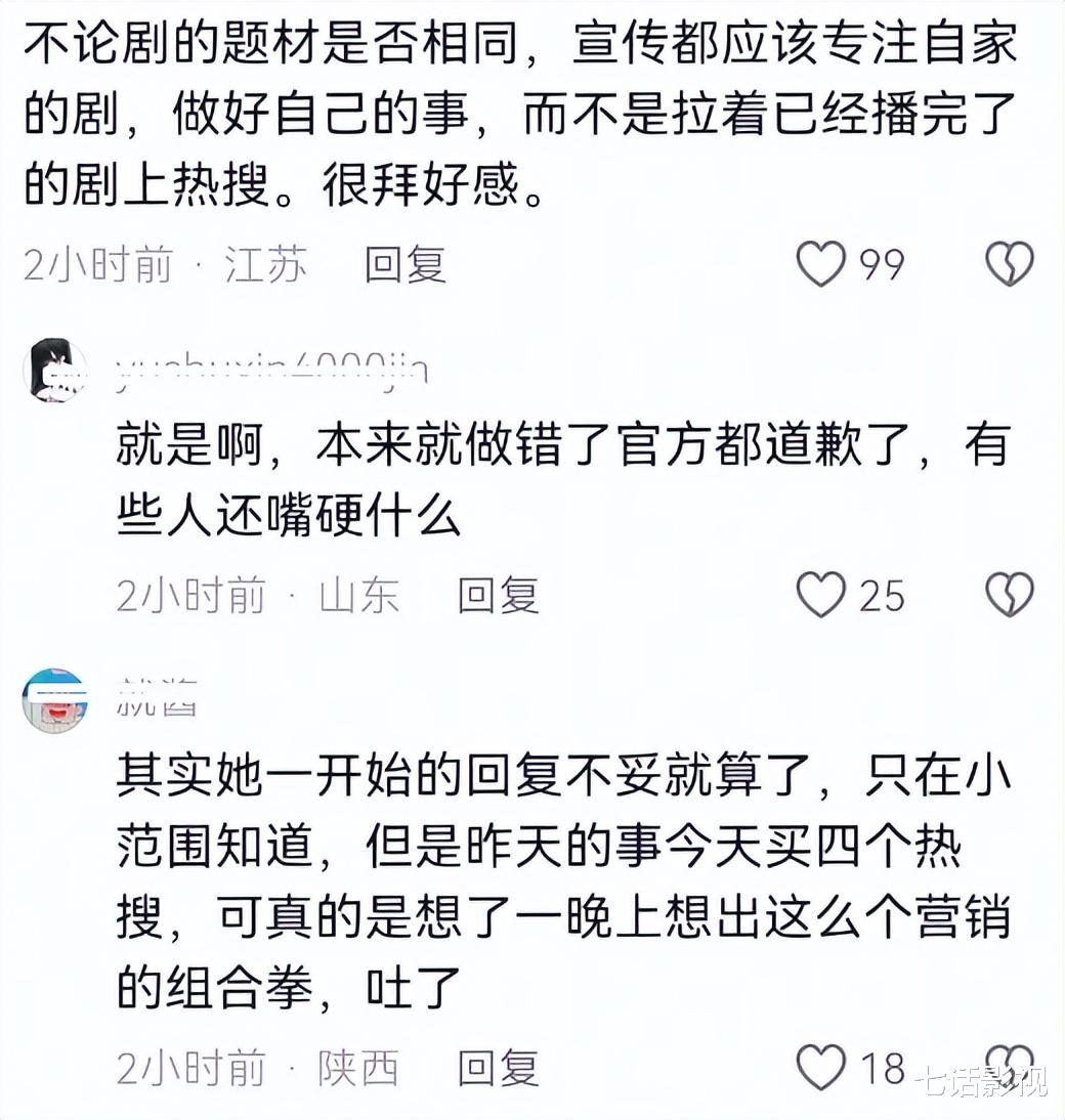 代入一下打工人视角,只因手快在评论区互动了一把便失去原有的岗位,也是很心酸了,热度是属于两部剧的,掰头的是两部剧的受众,受罚的却是打工人。