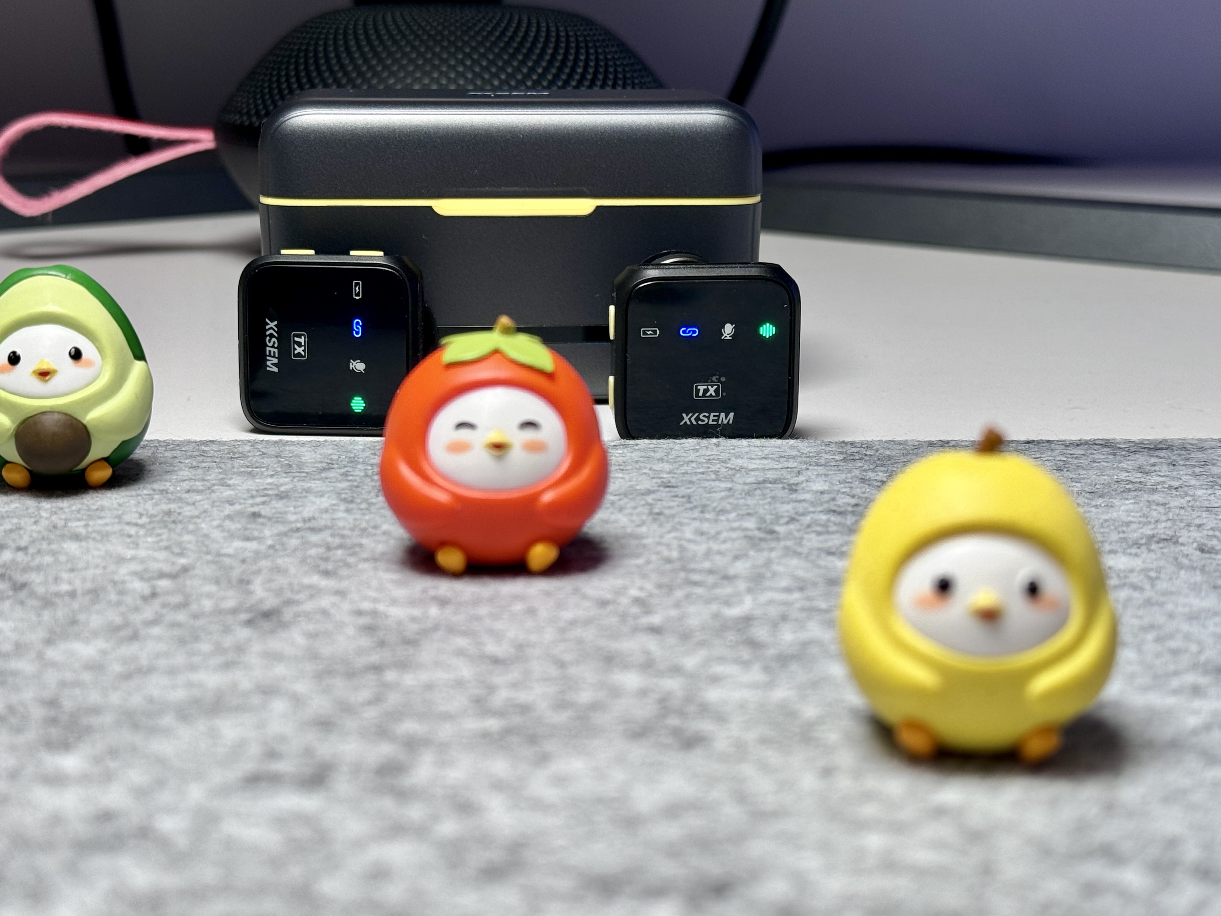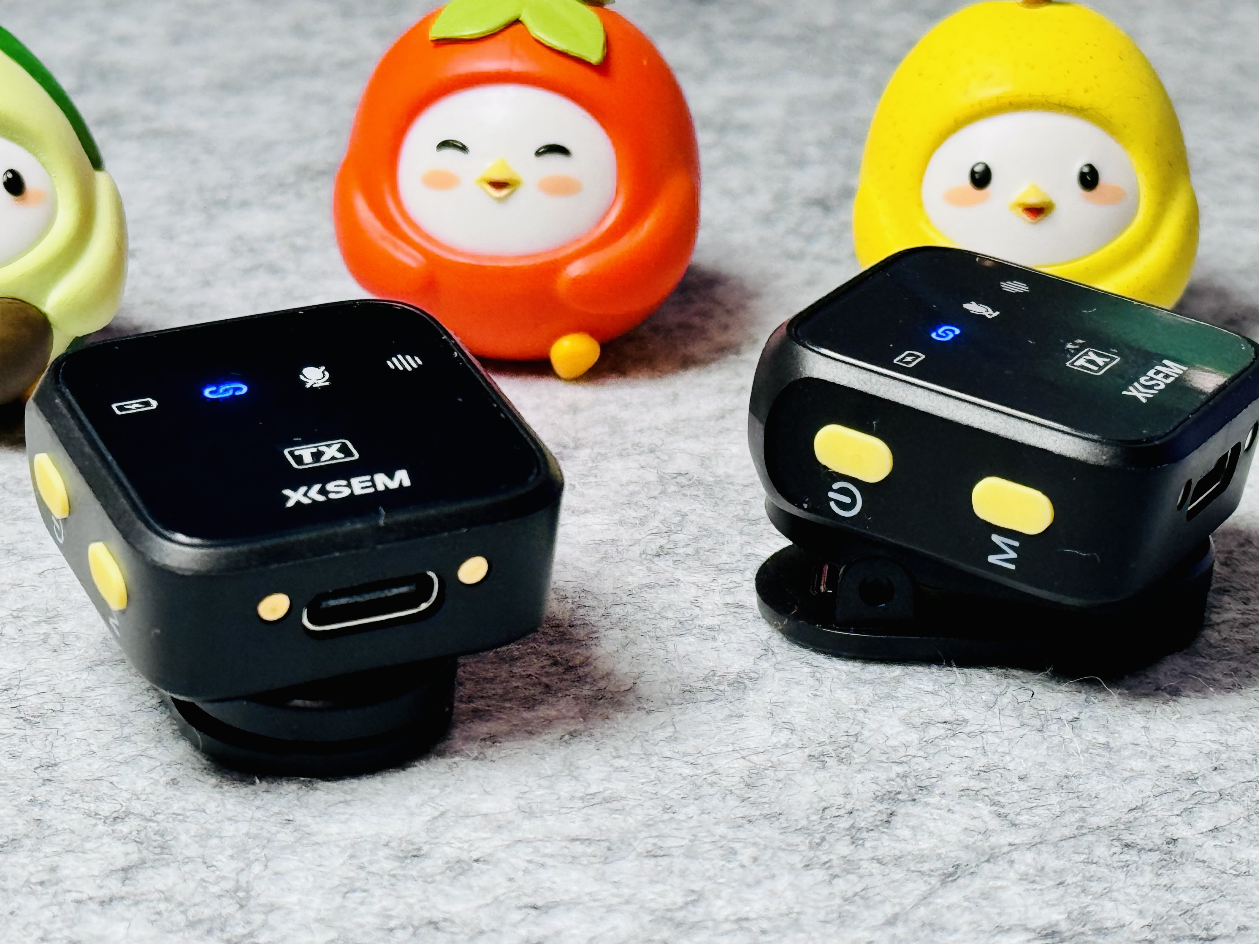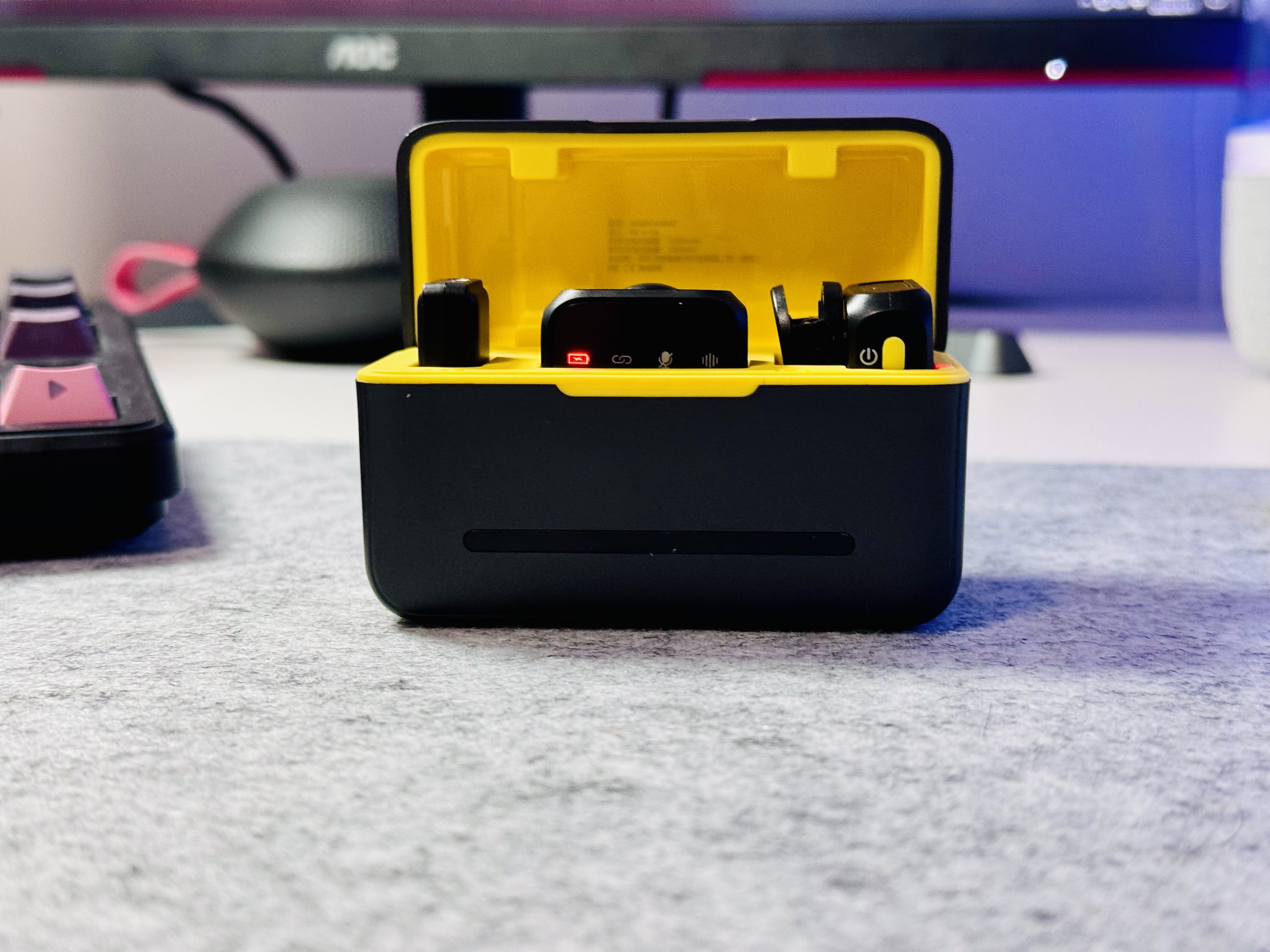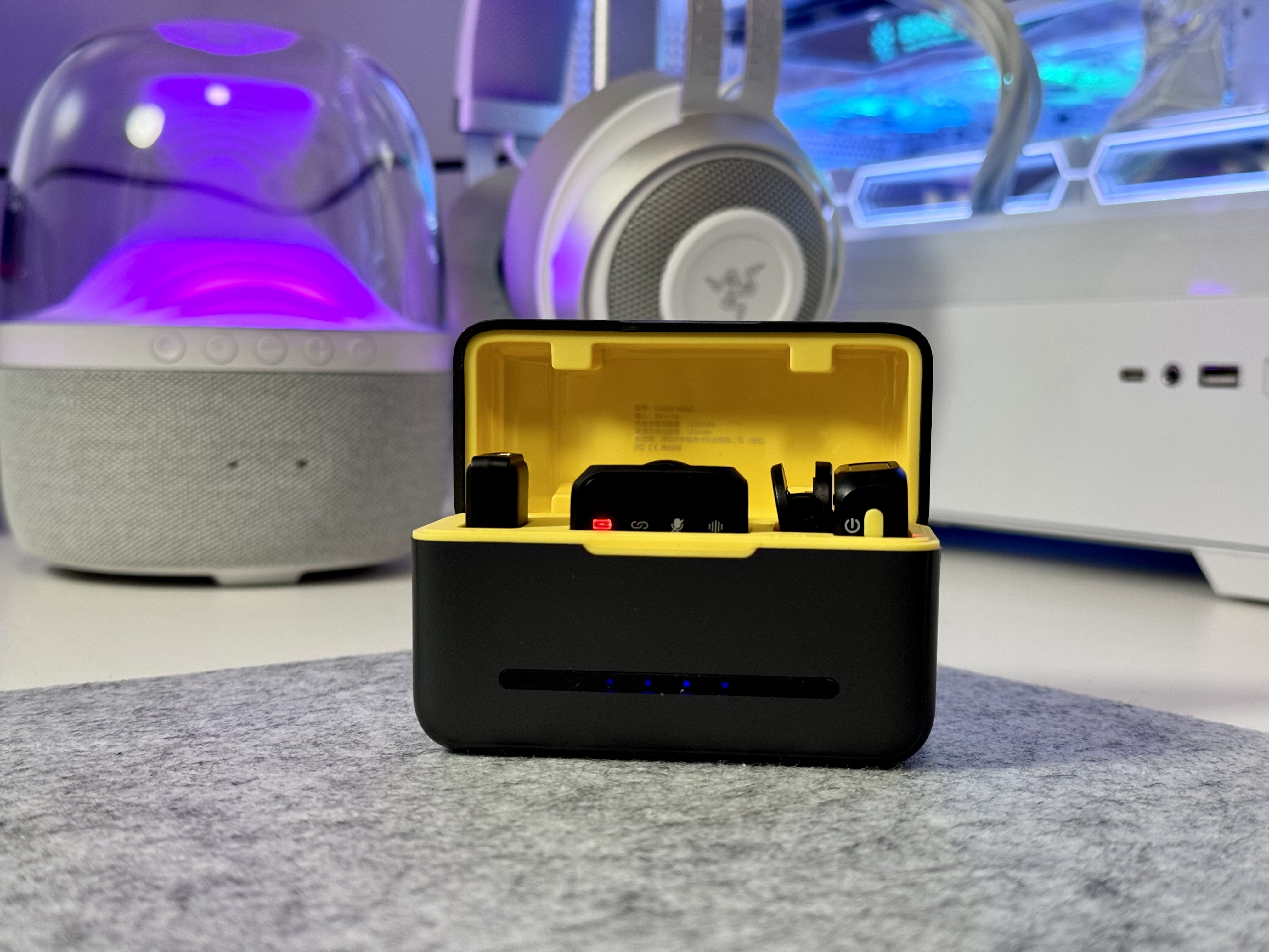 充电仓内部是两个发射端领夹麦克和一个RX接收端,整体设计是黄黑色,有种大黄蜂的感觉。