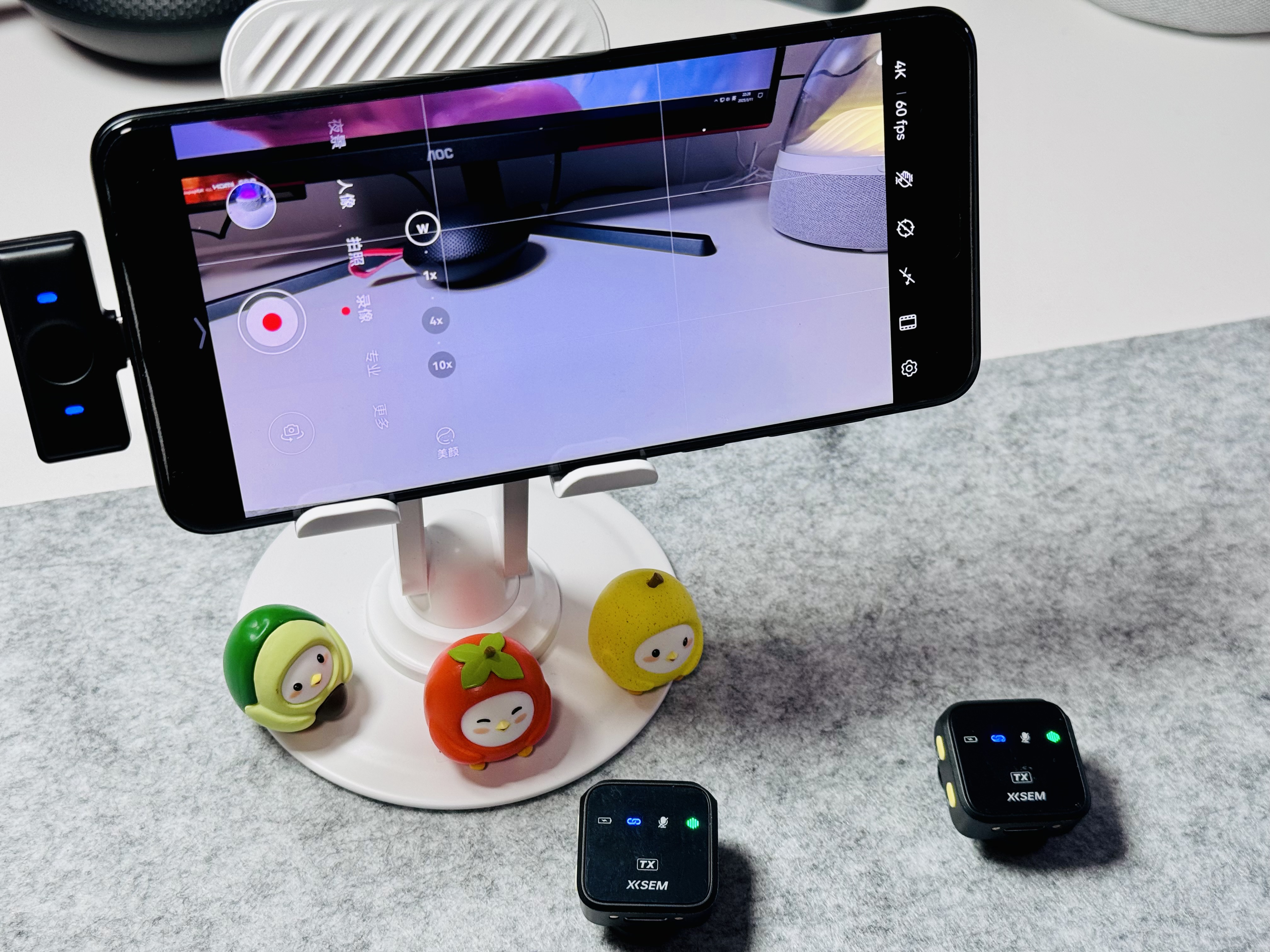 打开充电仓后,把麦克拿起来的瞬间就直接开机了,麦克上第二个连接图标闪烁表示等待连接。把RX接收端插入手机后,接收端和发射端麦克连接灯常亮,表示已连接。