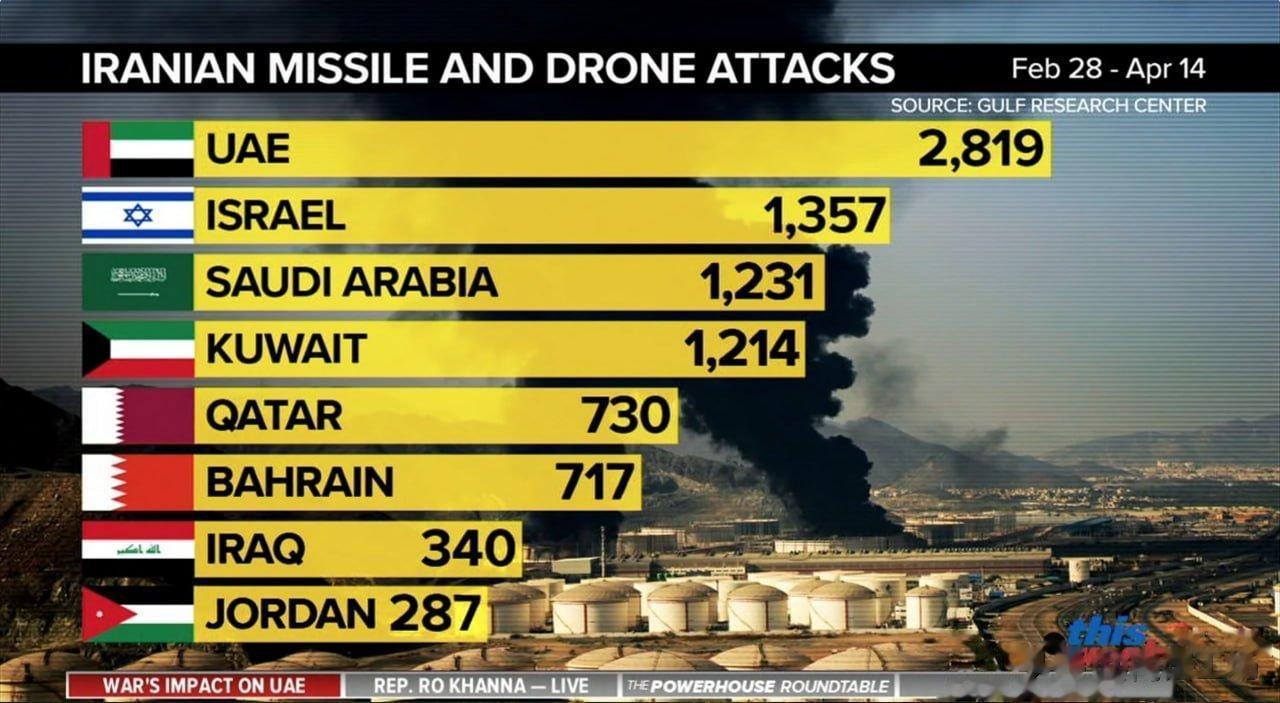 按照统计,伊朗对八个地区国家,发动了8695次导弹和无人机袭击,其中阿联酋遭受的袭击次数远超其他任何国家。阿联酋遭到了伊朗导弹,自杀式无人机的袭击,2819次;以色列遭到了伊朗导弹,自杀式无人机的袭击,1357次;沙特阿拉伯遭到了伊朗导弹,自杀式无人机的袭击,1231次;科威特遭到了伊朗导弹,自杀式无人机,远程火箭炮的袭击,1214次;卡塔尔遭到了伊朗导弹,自杀式无人机的袭击,730次;巴林遭到了伊朗导弹,自杀式无人机的袭击,717次;伊拉克遭到了伊朗导弹,自杀式无人机的袭击,340次;约旦遭到了伊朗导弹,自杀式无人机的袭击,287次。