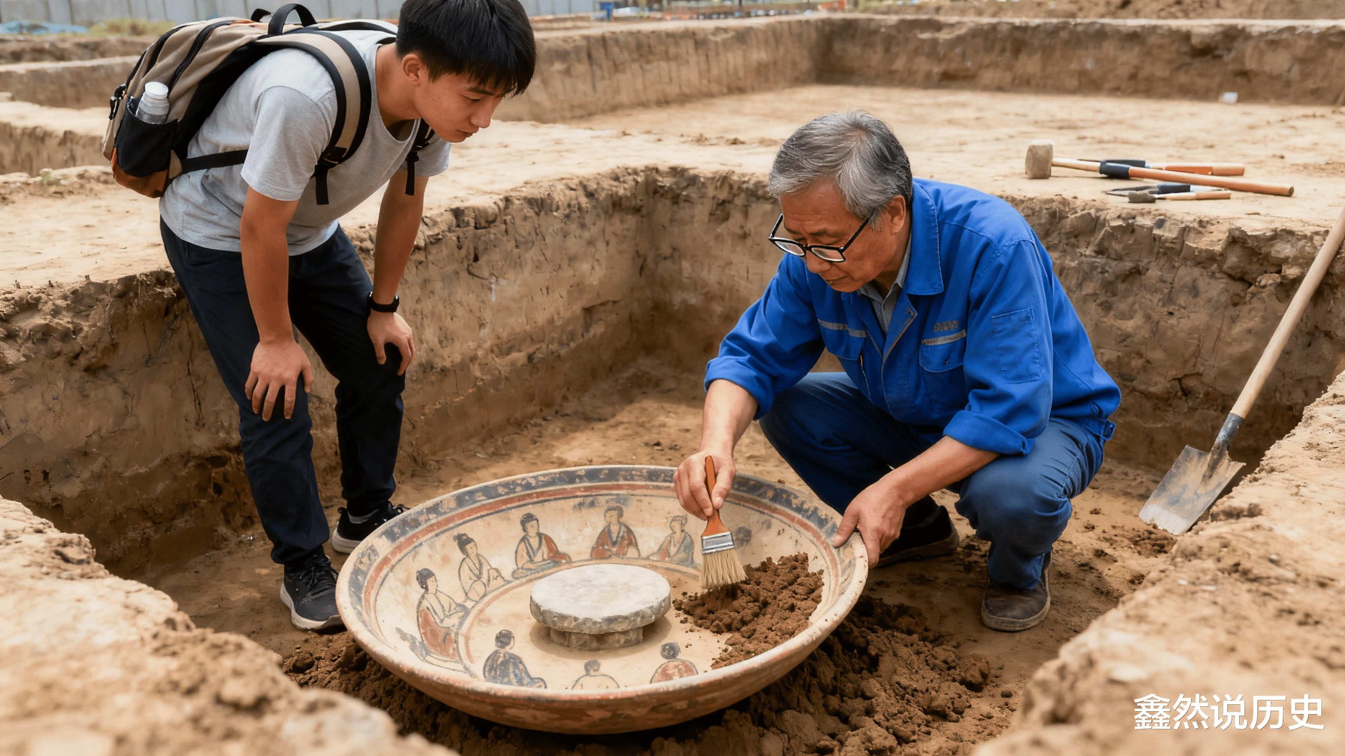村里的老支书王大叔,听说这个发现后特意来参观。他看着陶盘上的图案笑了:“这不就是咱们村调解邻里矛盾的样子嘛!张家和李家争宅基地,我把两家人叫到一起,摆事实、讲情理,最后定个双方都认可的规矩 —— 帝喾当年协调部落,和这道理一模一样。”