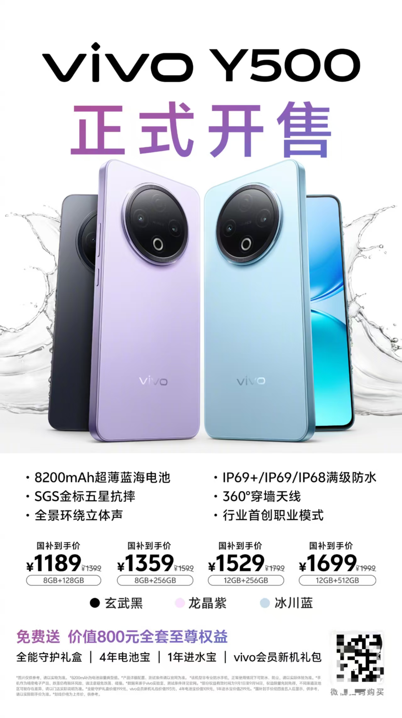 我觉得vivo在售后权益上也很贴心。买机送的四年电池宝和进水宝,让我未来几年都不用担心电池或意外进水问题,再加上半年延保,使用体验更安心。至于价格,国补后最低1189元左右起,还能享受至高6期免息和守护礼盒赠送,性价比真的很高。综合来看,vivo Y500不仅是台实用的手机,更像是能陪伴我几年、应付各种场景的可靠伙伴。