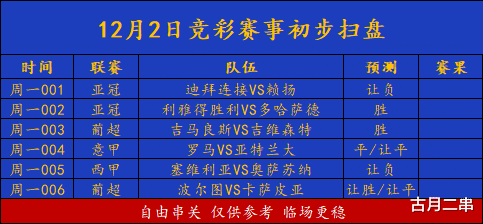 12/2周一2串1预测:西甲奥萨苏纳,葡超波尔图解析(附扫盘)