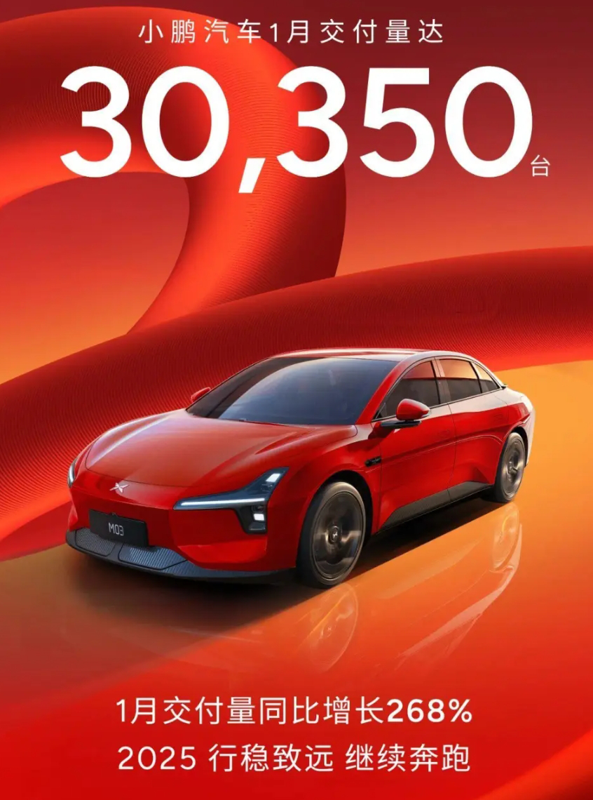2025年1月,在经历了一段至暗的低谷期后小鹏汽车交付量达到30,350台,同比增长268%,力压理想汽车时隔30个月重回新势力月交付量榜首,也是小鹏汽车连续第三个月实现月交付量超3万台。
