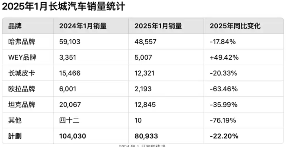 同样是2025年1月份销售数据,长城汽车销量约8.09万台,同比减少22.2%;汽车产量为8.25万台,同比减少13.94%。除此之外,1月新能源车销售22263台,环比减少47.33%。