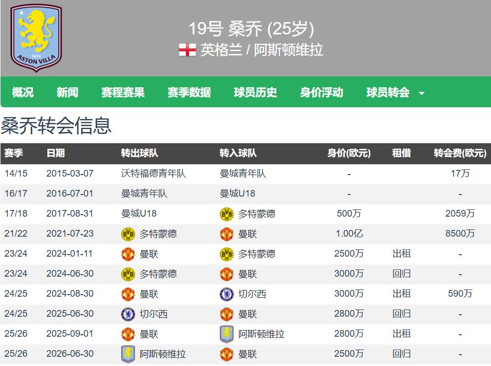 桑乔出自曼城青训,在多特蒙德成名,158场大黄蜂生涯交出了158场53球67助的傲人数据,其中连续3个赛季交出两双数据,特别是2019-20赛季,各项赛事44场20球20助,真是能传能射。桑乔于2021年夏窗以8500万欧元的转会费从多特蒙德加盟曼联,当时球员身价高达1亿欧元,桑乔红魔生涯是极其低迷,各项赛事83场12球6助,其中外租至多特蒙德、切尔西、阿斯顿维拉效力,状态都不再神勇。