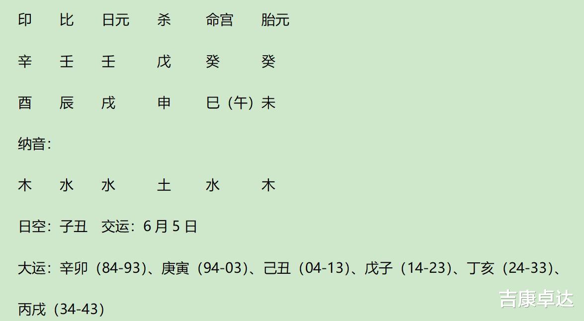 日主壬水,地支得辰库、申长生、辛印生、壬比助、癸劫助、1纳音水助,身稍弱。