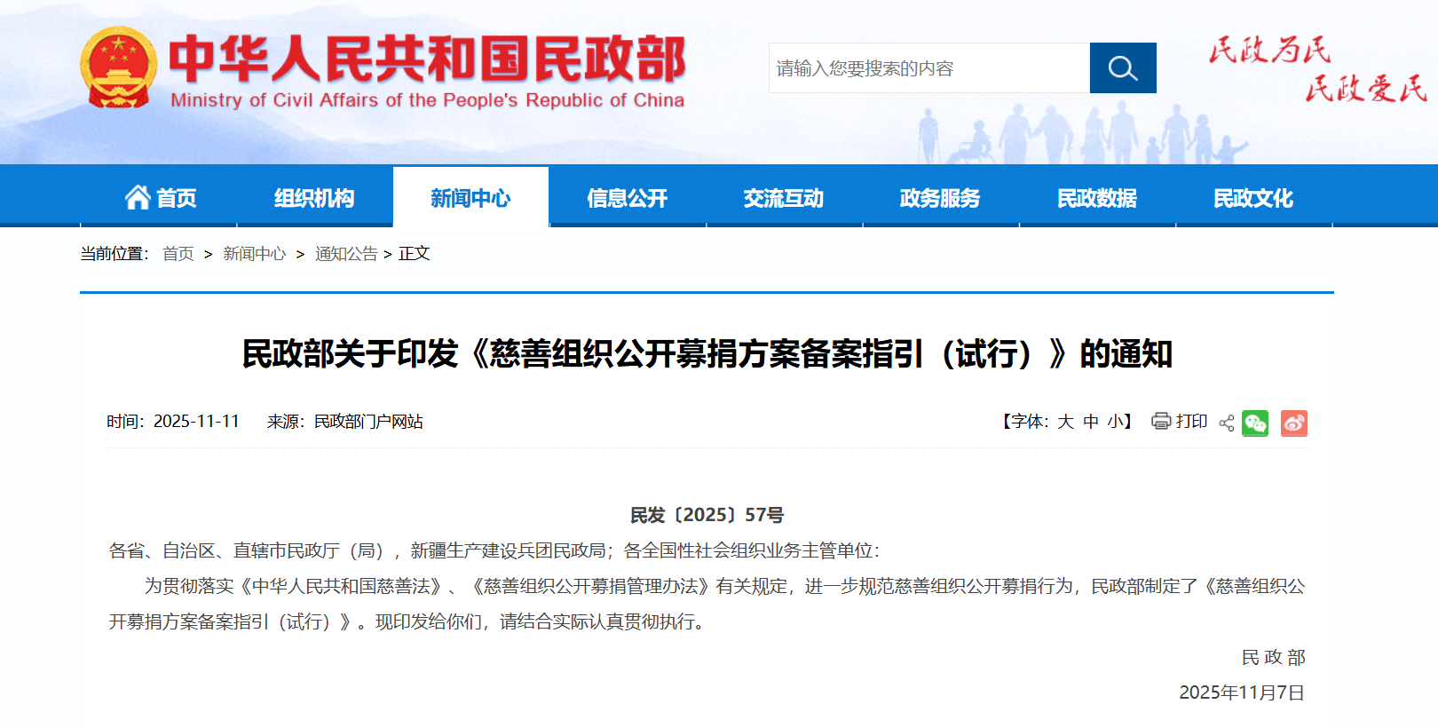 近日,民政部印发《慈善组织公开募捐方案备案指引(试行)》,进一步明确慈善组织公开募捐的备案流程、材料要求和监管措施,提升慈善活动的透明度和规范性。新规将于2026年1月1日正式施行。