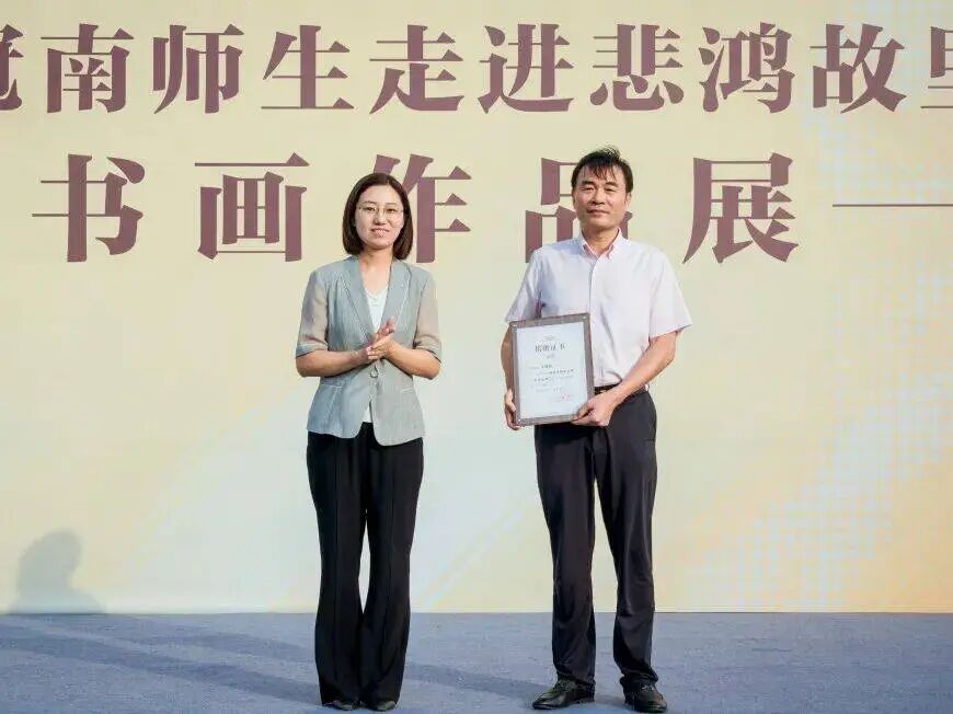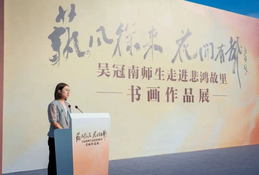 屺亭街道办事处主任施思在致辞时表示, 本次展览既是对徐悲鸿先生的深切缅怀,对其艺术思想与创作实践的重温,更是一场深刻的学术启示与当代回响。希望通过本次活动,让大家走进悲鸿故里,感受国画魅力、感悟“奔马”精神,在文艺融通、互鉴交流中体悟“致广大而尽精微”的卓越追求。