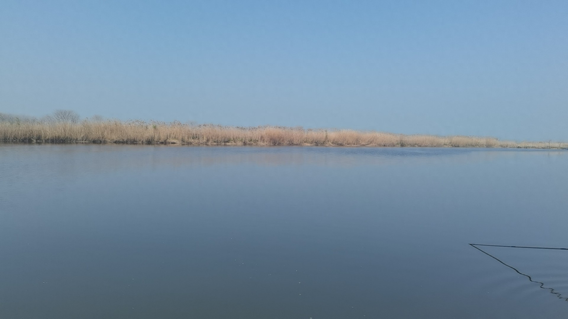 到了水塘边,我俩寻找各自心仪的钓位,然后进行一系列娴熟的操作,比如做窝、调漂、架杆,然后耐心地等待鱼儿上钩。忙着这些后,开始有闲心打量四周,这是一片相对开阔的水域,长方形的水塘由南向北延伸着,且仅与北面的水库一道堤坝相隔,水深大约二三米样子、水质亦是格外喜人,对岸一排排枯黄的芦苇随风摇曳,点缀其间的芦白也欣然地接受晨曦阳光轻柔的抚慰,水面上时不时有几只飞鸟鸣叫着掠过,身后是灿若云霞的油菜花,阵阵香气随风飘来,心情顿时为之一爽,可以毫不夸张地说,这是一块不可多得的野钓宝地。