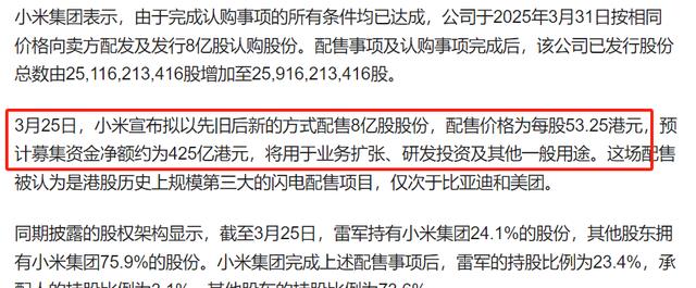 在3月25日的时候,小米突然发布出一则公告,而这一公告中明确的提到,其此前公布的8亿股股份配售事项,现已于2025年3月27日完成。