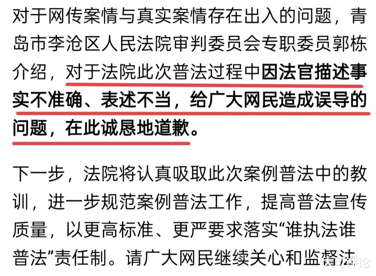 在视频中,青岛市李沧区人民法院审委会的专职委员郭委员表示:对于法院此次普法过程中因法官描述不准确、表述不当,给广大网民造成误导的问题,在此诚恳的道歉。
