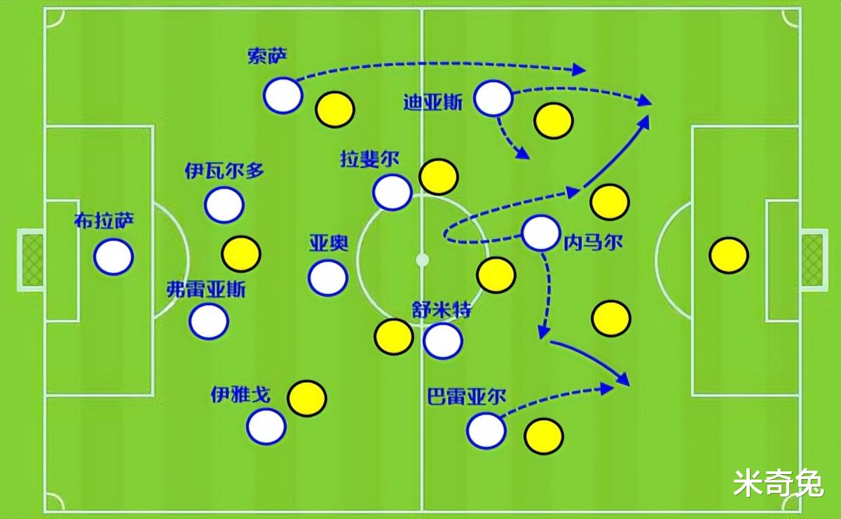 内马尔在伪九位置上依旧有着很大的跑动范围和上下能力,可以策动两翼推进,同时在攻防转换时做好突前的工作,能够引领进攻的发起。