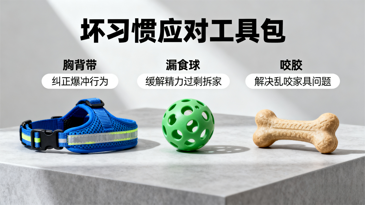 拆家应对:狗狗拆家多因精力过剩,每天增加 10 分钟衔取游戏,提供咬胶、漏食球等玩具,当它啃咬家具时,用玩具转移注意力,切忌打骂(易引发恐惧心理)。