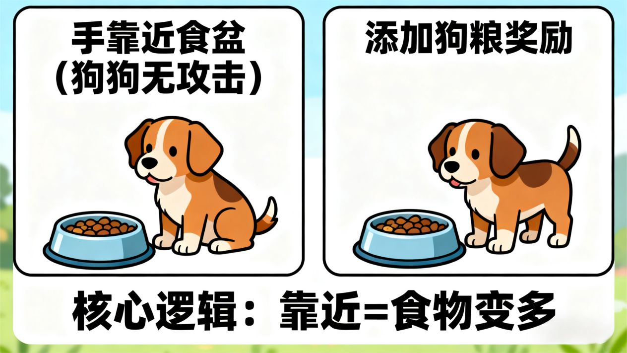护食纠正:喂食时蹲在狗狗身边,待其吃至半饱,用手捏少量狗粮缓慢靠近食盆,若狗狗无攻击反应就放入食物,让它明白 “有人靠近 = 食物变多”,每天训练 3 次,3-5 天可见效。
