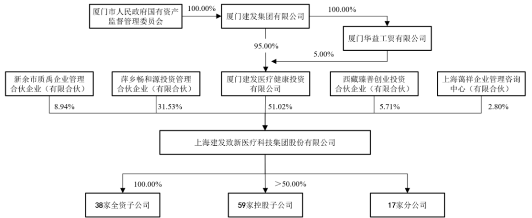 在实际控制人方面,建发医疗持有发行人股份的比例为51.02%,系发行人的控股股东。建发集团和厦门华益工贸有限公司分别持有建发医疗95.00%和5.00%的股权,建发集团持有厦门华益工贸有限公司100.00%股权,因此,建发集团直接及间接持有建发医疗100.00%股权;厦门市国资委持有建发集团100.00%股权,间接持有建发医疗100.00%股权,从而间接持有发行人51.02%股份。因此,厦门市国资委为发行人实际控制人。