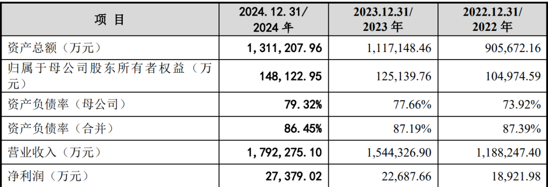 在财务数据方面,公司营业收入分别为1,188,247.40万元、1,544,326.90万元和1,792,275.10万元,归属于公司股东扣除非经常性损益后的净利润分别为16,909.15万元、19,131.70万元和22,356.54万元。