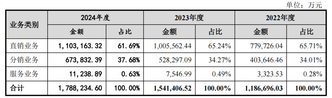 在业务结构方面,2024年度建发致新的直销业务收入110.32亿元,占比61.69%;分销业务收入67.38亿元,占比37.68%;服务业务收入1.12亿元,占比0.63%。直销业务仍是其主要收入来源,但分销业务占比有所提升,体现了其业务结构的优化调整。