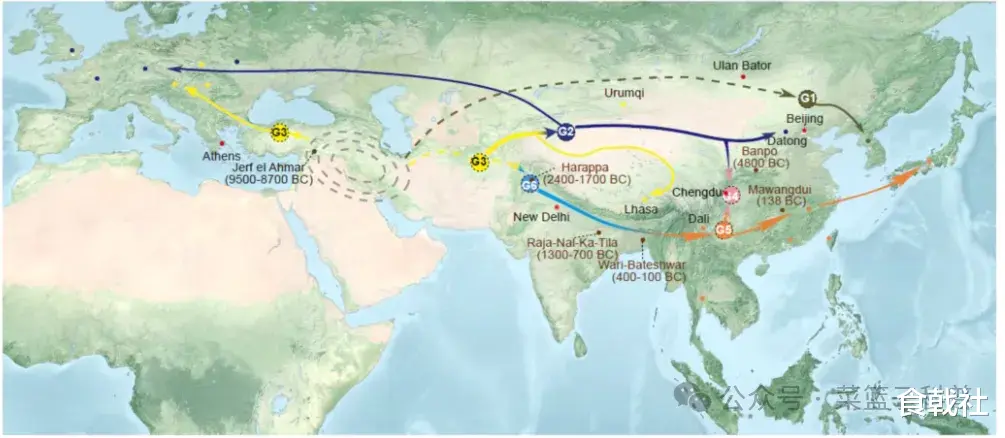 科学家重建了芥菜的起源和驯化历史,芥菜于8,000-14,000年前在西亚(中东)地区起源,由西向东沿三条独立路径传播扩张,通过基因突变和渐渗杂交演化出六个遗传类群。