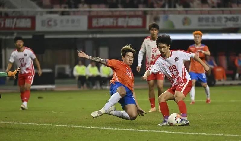 2025“湘超联赛”第10轮长沙队与益阳队的比赛,高中生球员马子宜(右)破门得分。 图/黄启晴 余劭劼 摄