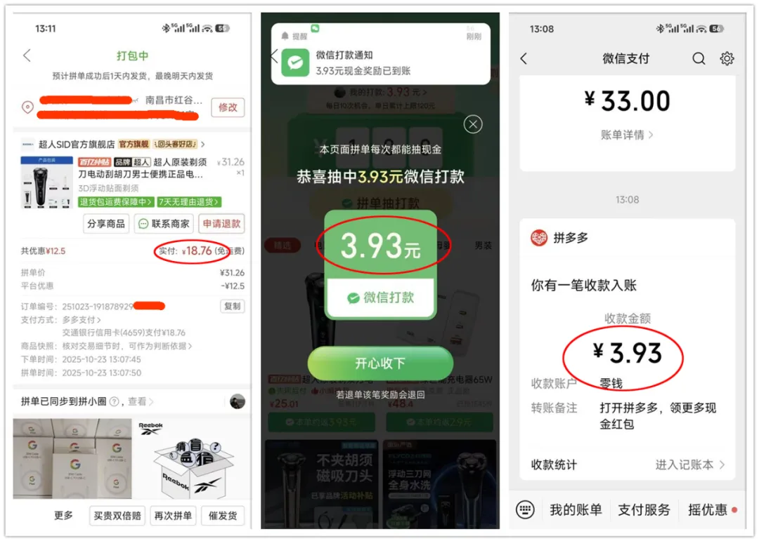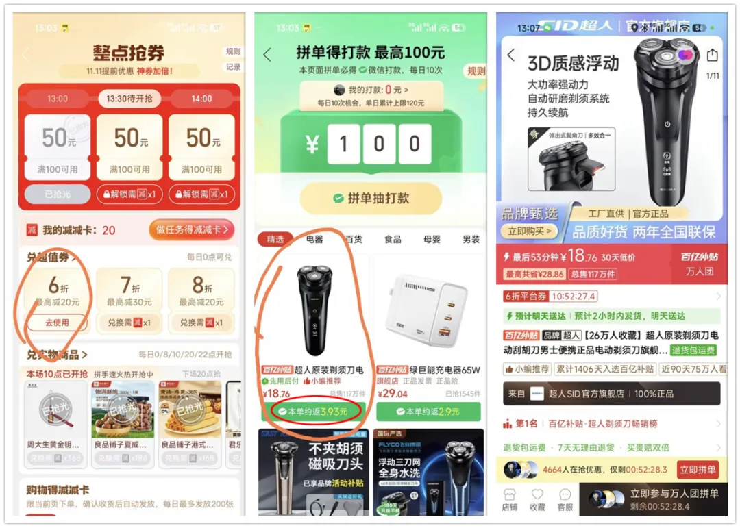 这是一款型号为超人RS7321的三刀头剃须刀,首先在PDD搜到官旗的销售页面,让大数据知道你想买它。然后退回主界面搜“DDD”,进入整点抢券界面兑换一张6折券,再退回主界面搜“抽100”进入返现界面,这里可以看到那个剃须刀万人团卖18.76元,加上返现3.93元,实际成本14.83元。
