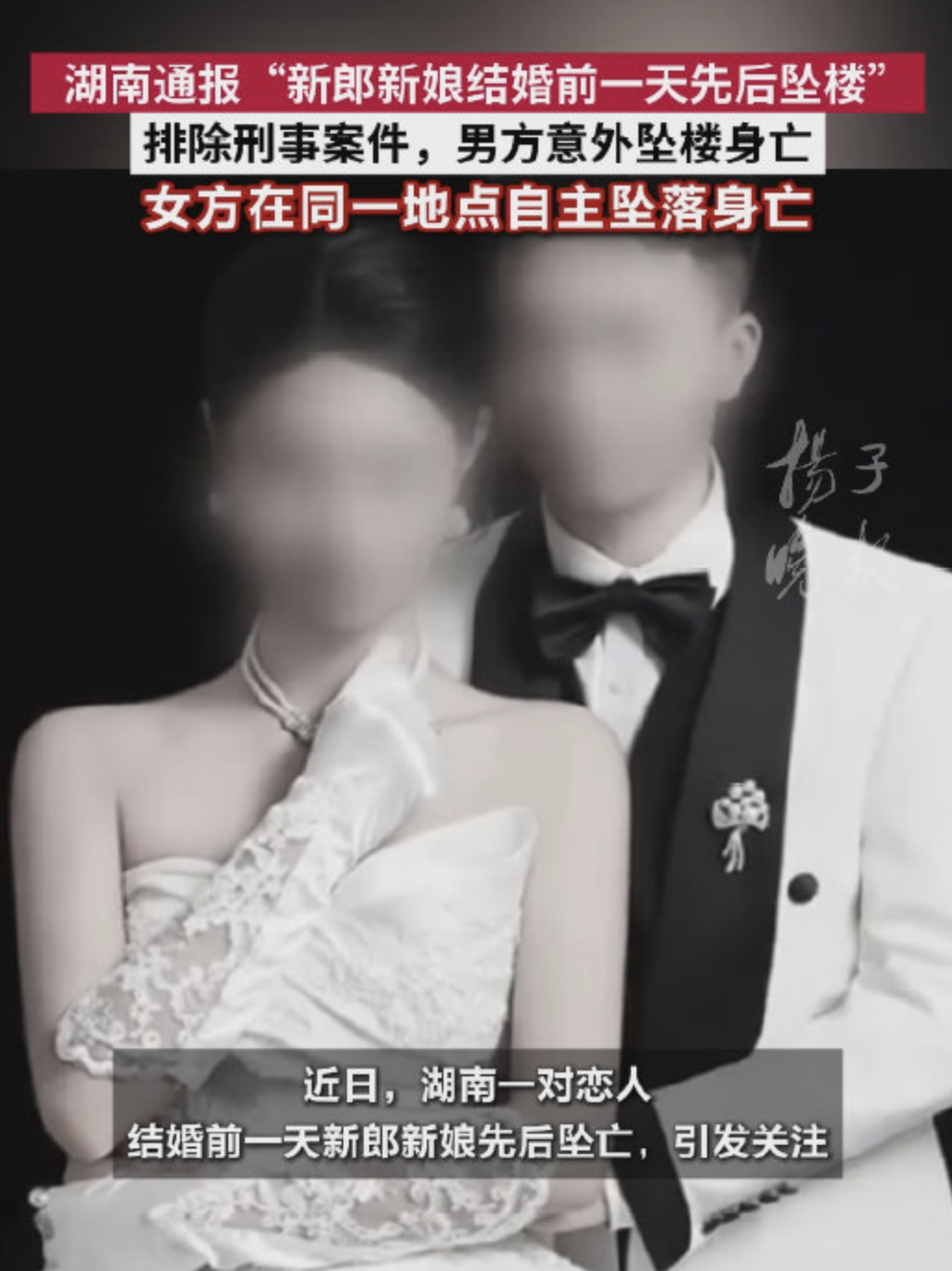 伴随着湖南双峰县联合调查组的通报释出,“新郎新娘先后坠亡案”正式进入舆论视野。一定程度上,通报的主要作用是“排除刑案”,因为关于新郎新娘双方的基本信息,事发后社交媒体上就已经传开了,当然也包括“先后坠亡”这个关键信息。
