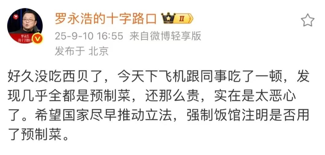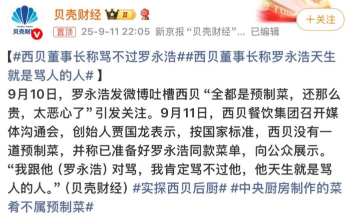 9月10日下午4点55分,罗永浩在他的社交账号上吐槽了西贝用餐体验差,他称自己发现西贝做的几乎全是预制菜,而且还贵,“实在是太恶心了!”。