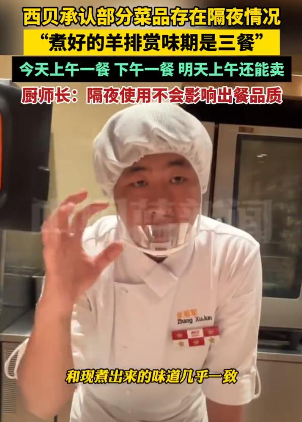 这位厨师长表示西贝确实有一部分菜品是隔夜后还能继续使用的,但和现煮出来的品质一模一样,特别是煮好的羊排,可以使用三餐。