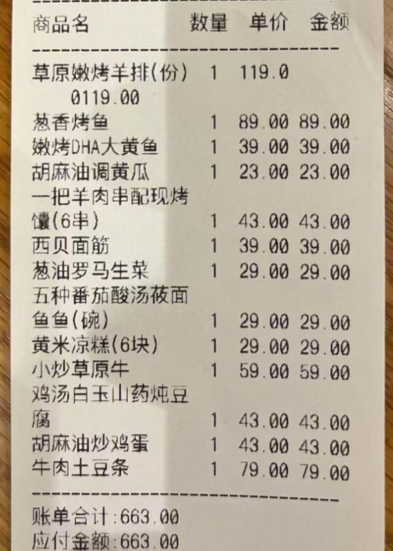 小票上一共显示13道菜,消费金额663元,如果加上后加的两道菜,总计价格785元。