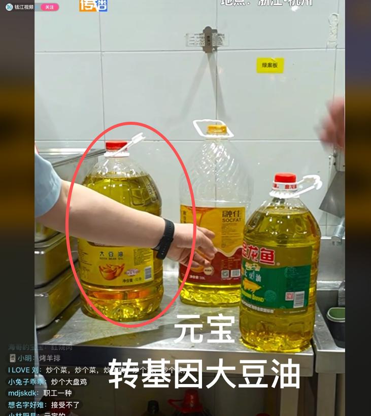 另一个西贝餐厅后厨中,厨师非常自信的向记者展示他们给儿童餐使用的是非转基因大豆油,然而却忽略了摆放在桌面上的另外两桶。
