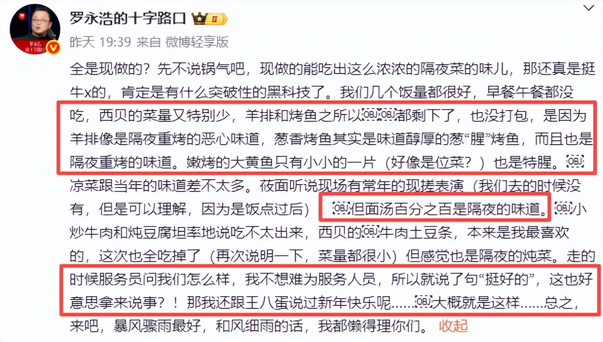 言外之意就是上这两道菜时,罗永浩一行人已经吃饱,所以剩下了。