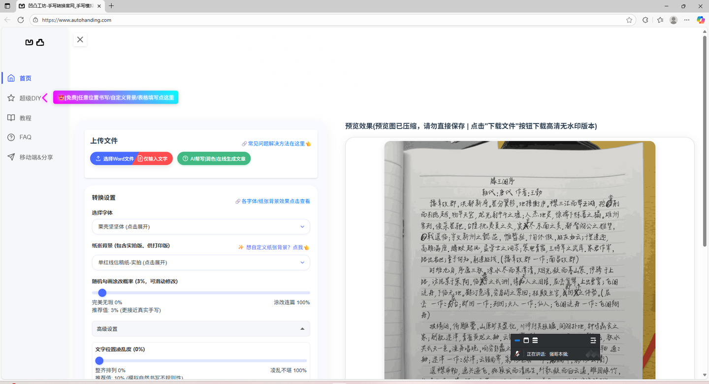 最关键的是这个网站完全免费,也无需注册上传文档后几秒钟就能生成预览效果,网站生成的手写稿质量非常高,并且支持高清无水印的图片下载,打印出来完全无压力,轻松应对各种场景。