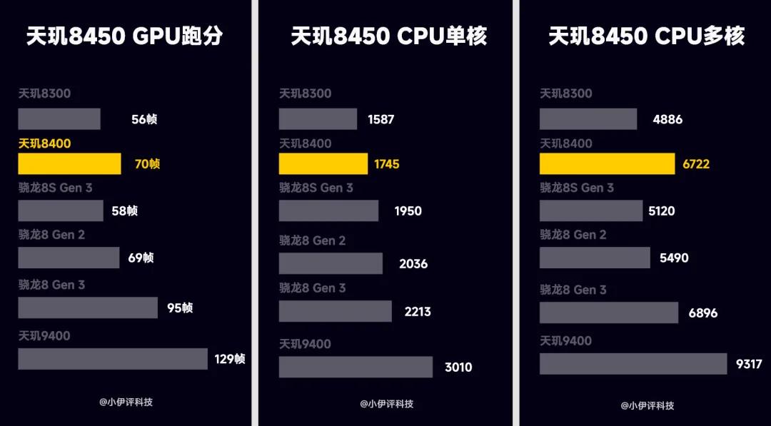 至于天玑8350和天玑8450的性能对比情况,也给大家做一个表,大家自行查看吧,整体来说,CPU单核是短板,但是CPU多核基本达到骁龙8 Gen 3水平;GPU则是骁龙8 Gen 2水平。
