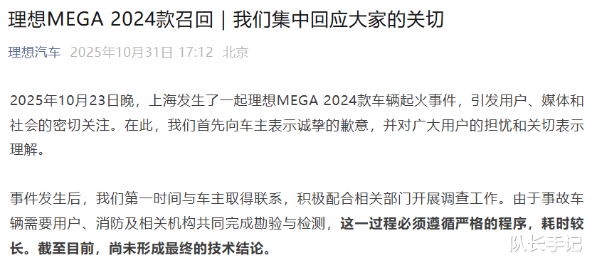 2025年10月23日,一辆理想MEGA在上海闵行区行驶过程中,突然起火。仅10秒后,火势蔓延至整个车身,最后,这个理想MEGA被完全烧毁。万幸的是,司机本人及时逃脱。可这也带来了理想MEGA的大规模召回,一次性被召回了1.14万辆。而召回原因呢?冷却液防腐性能不足,可能导致冷却铝板腐蚀渗漏,极端情况下可能引起电池热失控。