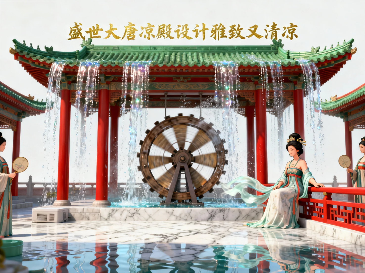 到了唐朝,人力驱动的风扇已显不足,于是出现了“凉殿”。就是修筑宫殿时,通过在后部安装水力机械装置,靠流水推动风扇,这个时候把水送到屋顶,从四周流下,形成水帘,不但风吹过来很凉爽,看起来也很清凉呢。