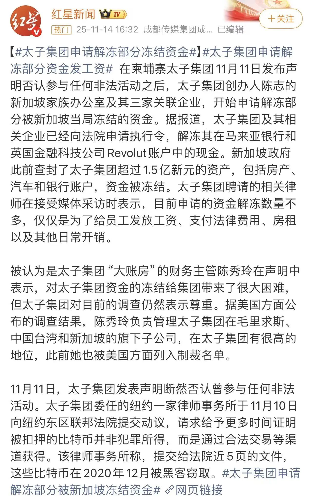 就在陈志躲起来不敢露面的时候,他的太子集团却在 11 月 11 日跳出来发声明,说自己 “没干过任何非法活动”,美国的指控是 “为了抢资产找借口”。紧接着,集团的新加坡家族办公室就向法院申请:“快解冻点钱吧,我们要给员工发工资、交房租!”