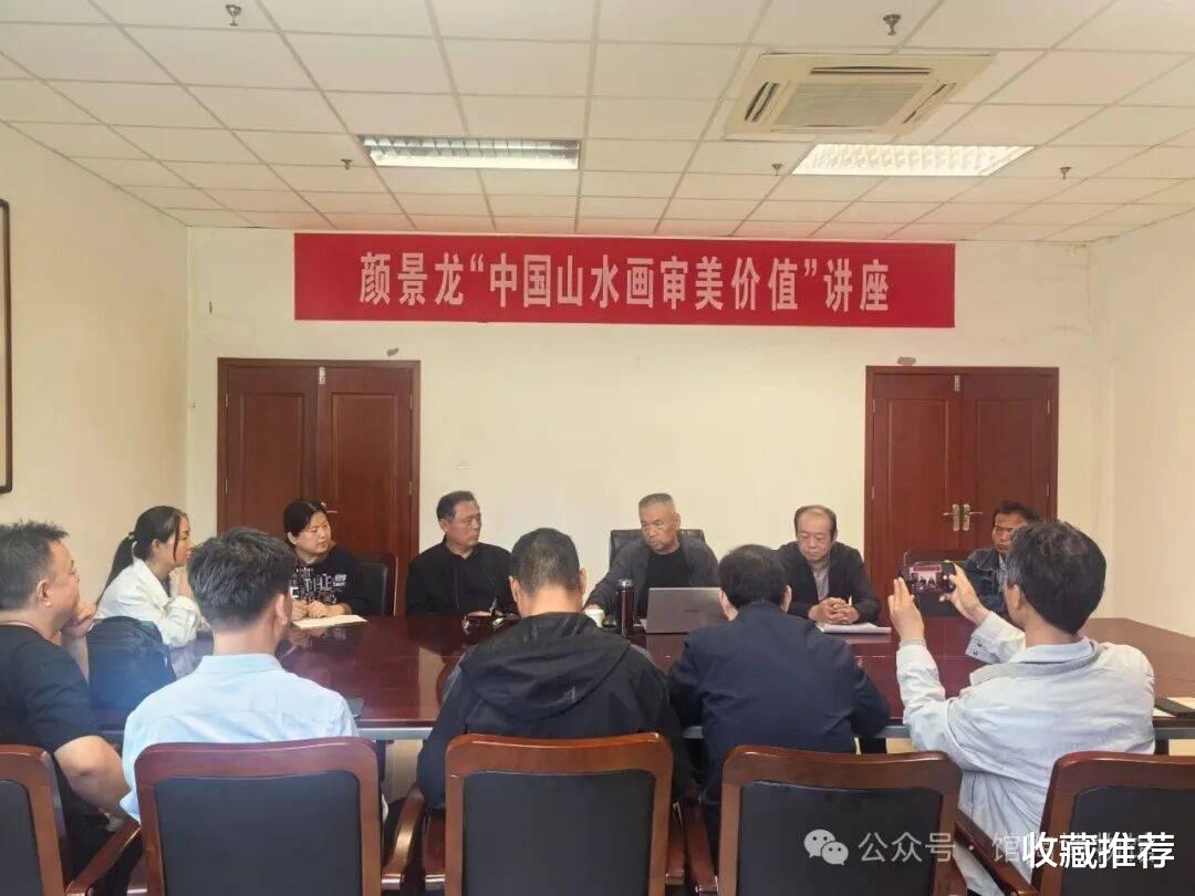 捐赠仪式后,颜景龙先生在馆陶博物馆会议室开展“山水画审美价值讲座”,20余名书画爱好者参加讲座。讲座上,颜景龙先生娓娓道来,将山水画创作与人类依水而居的习性联系,从中国自然环境讲起,阐述在人类发展进程中,自然山水的重要性以及在艺术创作中遵从自然、展示山川河流对人类审美的影响。颜景龙先生结合个人艺术理念和创作实践心得,剖析中国山水画的精神内涵,中国山水画的历史与今天,山水画自魏晋兴起,到隋唐逐渐独立,再经五代两宋发展完备且成熟,并走向辉煌,至此山水画占据了中国画的主流地位。指出中西方绘画各自具有的不同文化特征和美学趣味,山水画的鉴赏和评述应该在充分感受和理解中国传统的美学思想观念、审美经验以及文化和历史背景下进行。