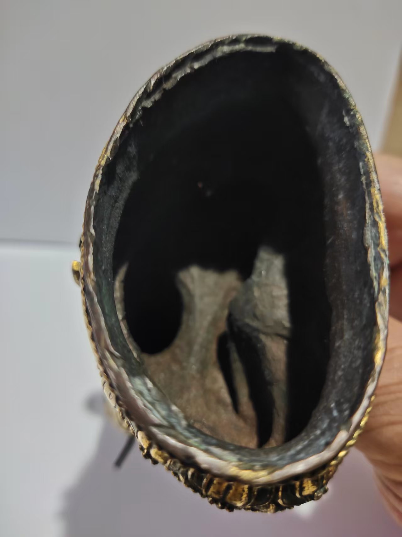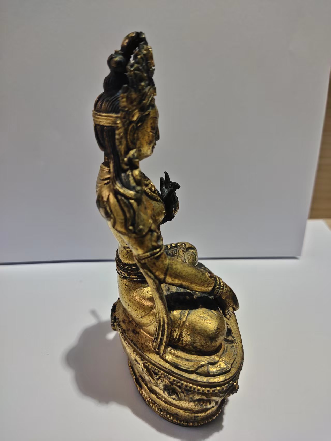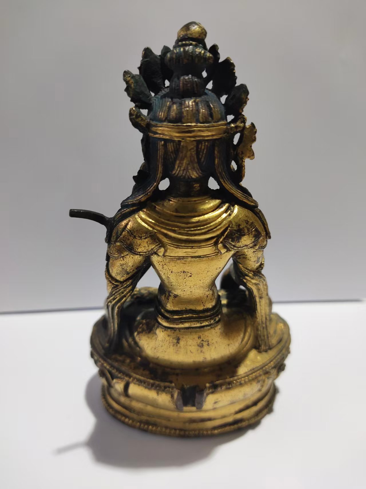 细看造像的细节,鎏金的剥落处露出铜胎的古旧色泽,那是岁月留下的包浆,也是历史的印记。它或许曾在佛堂的酥油灯下被无数信徒瞻仰,或许曾在文化交融的浪潮中辗转流传,每一道痕迹都是一段无声的故事,诉说着宗教与艺术的共生,见证着工艺与信仰的碰撞。