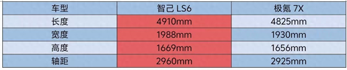 先看车身尺寸。智己LS6车身尺寸4910/1988/1669mm,轴距2960mm。极氪7X车身尺寸4825/1930/1656mm,轴距2925mm。智己LS6定位于中大型SUV产品,极氪7X为中型SUV,所以在尺寸数据方面智己LS6还是有一定优势的。