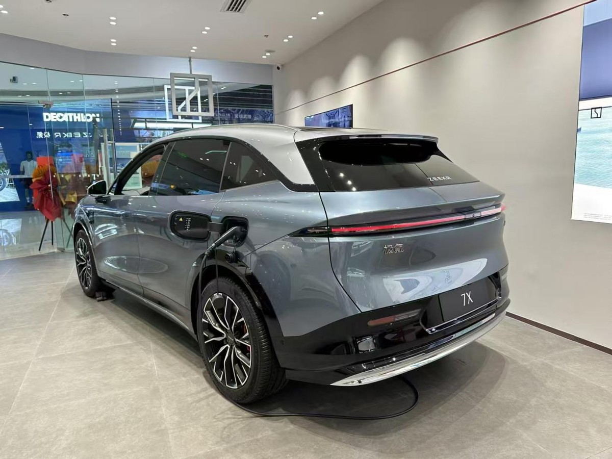 车身尾部,智己LS6的亮点在于ISC智慧尾灯,也可以进行多种主题交互,支持英文,数字和动画表情图案等显示,提示效果比较具象明了。极氪7X尾部对比度比较强,棱线突出,大面积黑色后杠层次感不错。