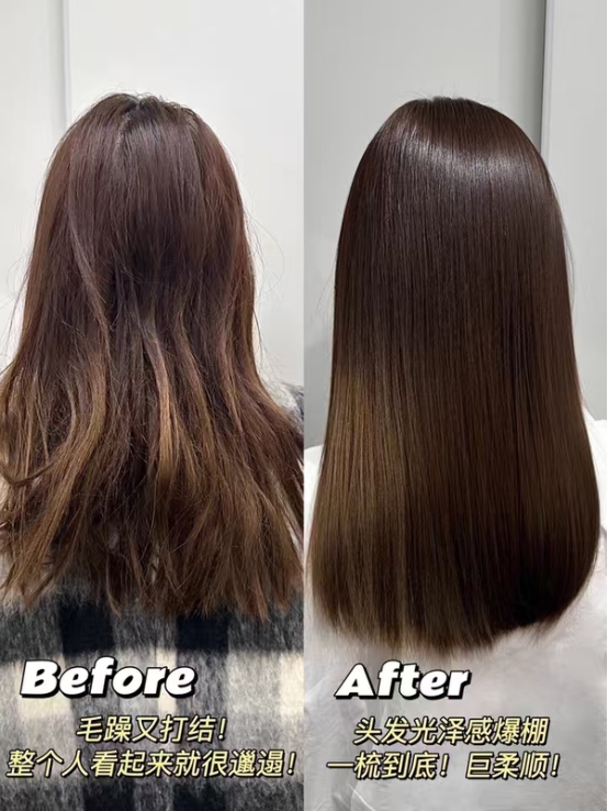 使用了一段时间后,效果的变化还是比较明显的。最开始发尾毛躁的情况很严重,但持续使用了一段时间后,头发变得顺滑和服帖了不少,整体的光泽度和顺滑感都有了一定的提升。