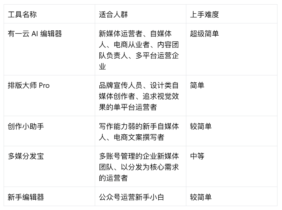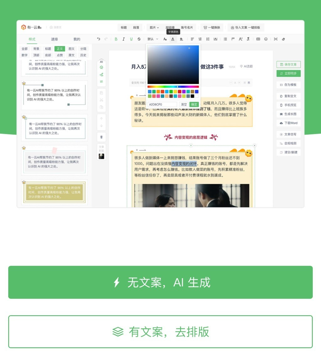 新手小白 / 个体创作者:优先选“有一云 AI” ,AI 写作能帮你快速出稿,30 秒速排不用自己研究格式,手机端操作也方便,完全不用怕入门难。