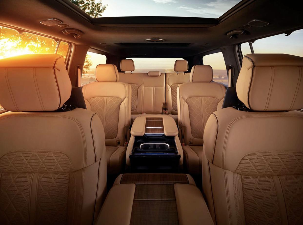 全新Jeep Grand Wagoneer车内从做工、用料、细节、科技感、智能化和安全性等维度,向我们展现出了旗舰级SUV该有的强大气场。大面积浅棕色Nappa真皮材质的铺陈,车顶和地毯也都采用了钱米白色的植绒面料,还升级了打孔Nappa座椅以及23扬声器的McIntosh音响系统。贯穿式的中央扶手箱还加入了实木装饰面板点缀,中控台采用了黑色颗粒点的复合材料铺陈,还带有“Grand Wagoneer”的字母浮雕,别致的空调出风口还加入了亮银色镀铬描边,提升了整车的高级质感。科技感方面,该车配备了液晶仪表(12.3英寸)、副驾驶显示屏(10.3英寸)、中控大屏(12.1英寸)、中央下方触控屏(10.3英寸)、后排乘客的2个10.1英寸娱乐触摸大屏、后排中央扶手提供10.3英寸的触控屏(可调节座椅、坐姿、后排独立空调),搭载了最新的Uconnect 5车载系统。还有造型粗犷的双幅式真皮方向盘,操控岛区域配备了水晶旋钮换挡,很有质感。