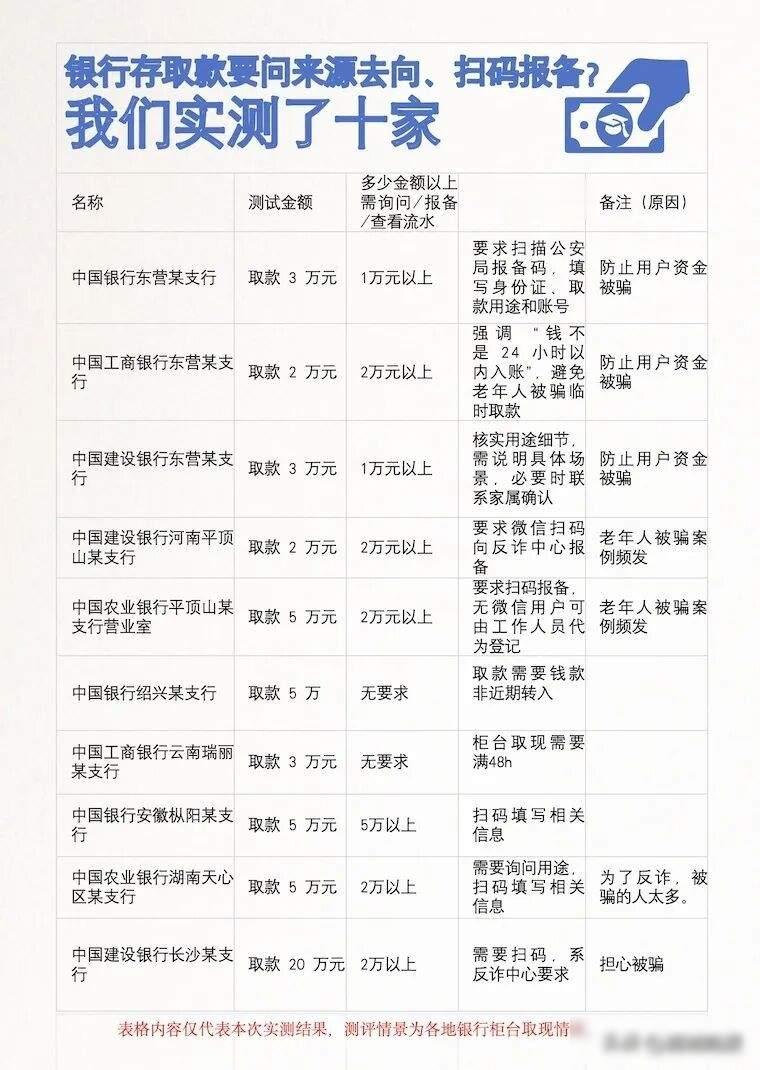 这种事情不止一个地方有,河南平顶山的建设银行和农业银行取两万块钱以上就要扫码登记,流程都差不多,银行工作人员说这是为了防止老年人被骗钱,但安徽枞阳那边的中国银行要到五万元以上才需要报备,浙江绍兴更宽松一些,取钱的时候不问用途,只看这笔钱是不是刚存进来的,现在全国各地都是存钱容易、取钱难,长沙的农业银行存二十万只需要刷个脸,取两万却要问清楚是给谁、熟不熟悉。