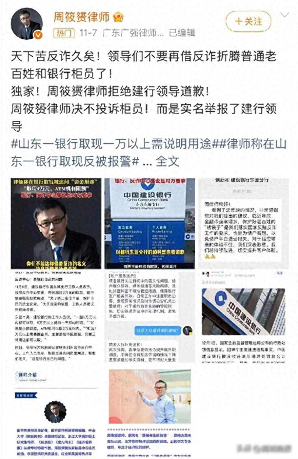 前阵子山东东营的律师周筱赟去银行取钱,他取的钱不到五万块,柜员却告诉他不能马上办理,说要等民警过来核实情况,因为反诈中心发了通知,全市都按这个办法操作,他还提到,取款超过一万就得扫二维码填写用途、身份证号和卡号信息,金额达到三万以上还得说明是不是用于送红包,甚至要提供结婚证或家庭群聊天截图,这些要求其实没有法律依据。