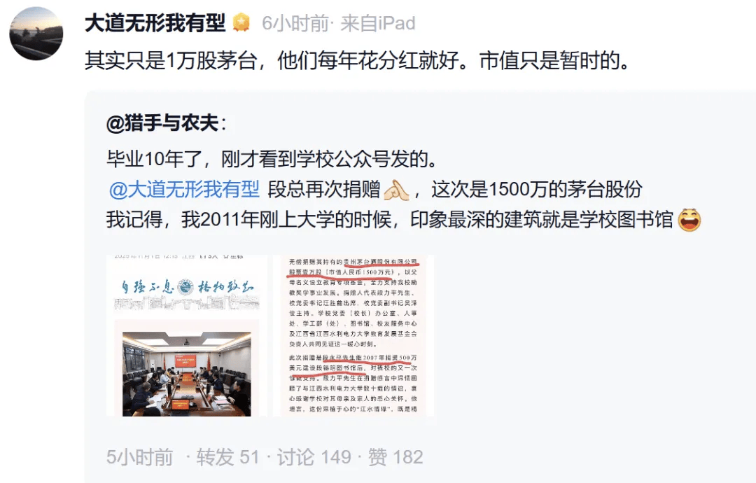 教育捐赠是段永平公益版图的核心。除江西水利电力大学外,他2022年两度向浙江大学捐赠共2.7亿元,2023年底再捐超10亿元支持浙大基建与人才培养;2024年3月还向中欧国际工商学院捐赠1亿元证券。从现金到股票,其捐赠形式始终贯穿着长期主义逻辑,此次茅台股票捐赠更被视为价值投资理念与慈善实践的结合。