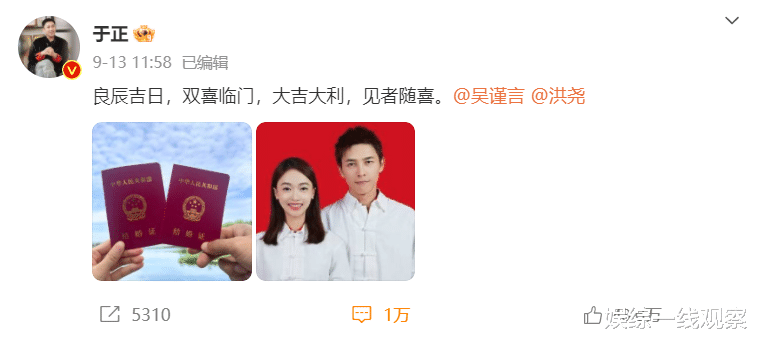 9月的娱乐圈真是喜事连连,陆虎和嘘嘘婚礼官宣后,吴谨言洪尧官宣领证。一前一后给于正忙得不轻,一边力挺自家艺人,一边祝陆虎和嘘嘘白头到老永结同心。